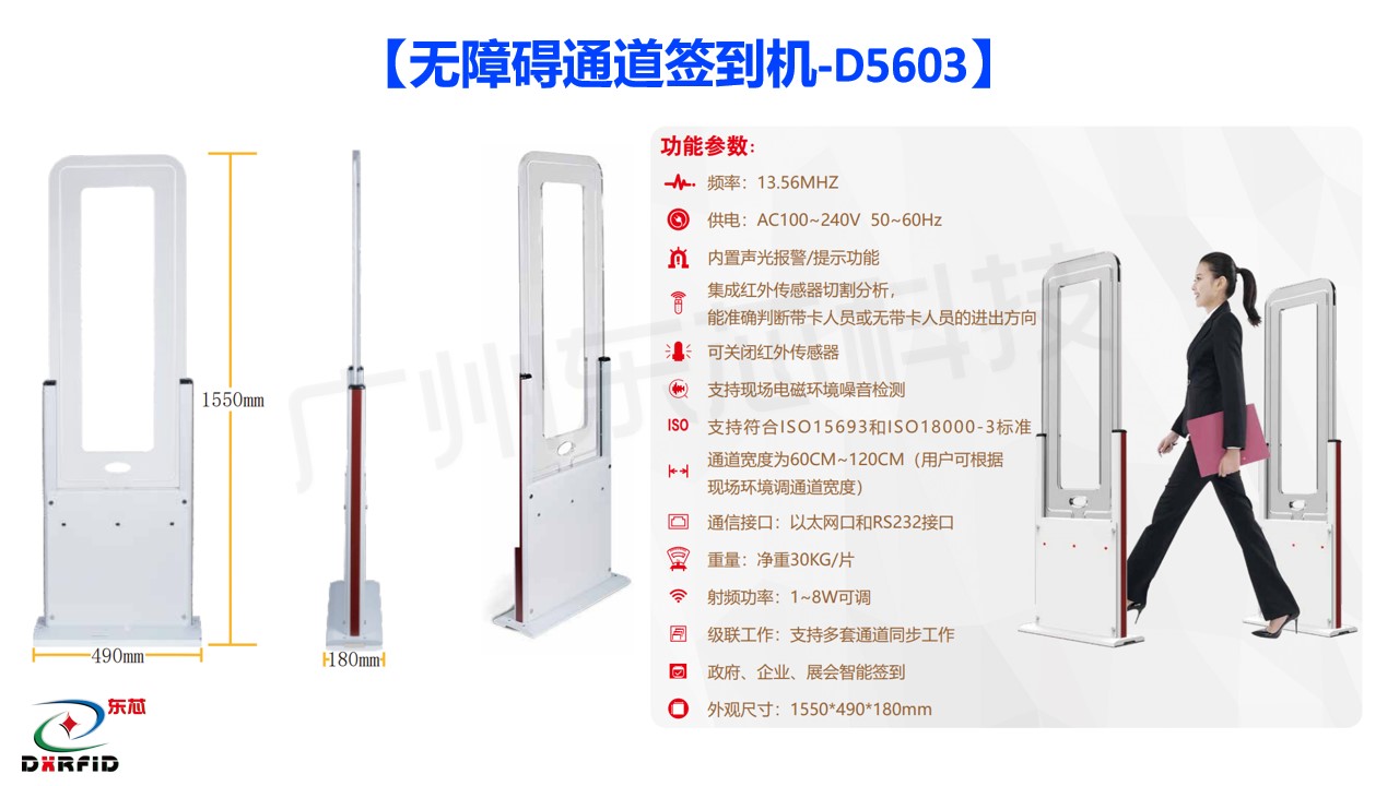 东芯开放式无障碍智能通道集成了13.56M高性能大功率读写器和红外传感器技术,能快速准确地识别带卡及无带卡人员的进出,并可通过红外