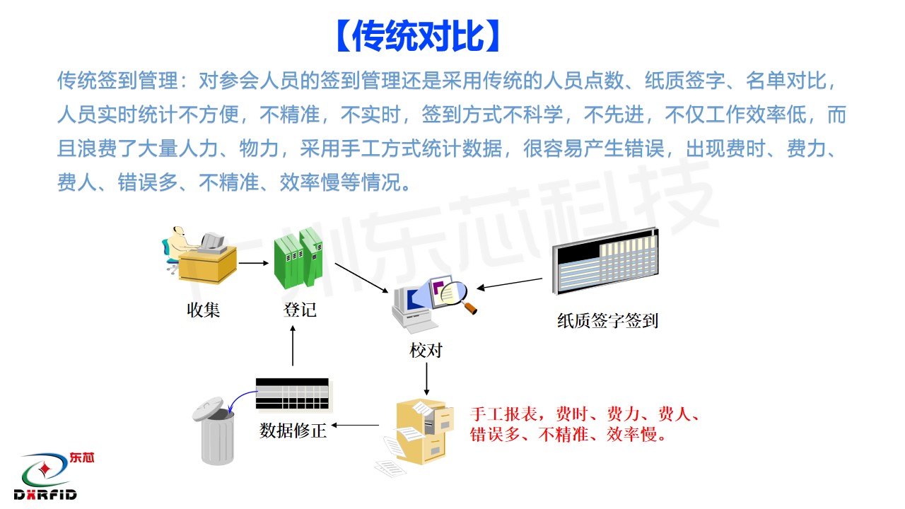 传统签到管理:对参会人员的签到管理还是采用传统的人员点数、纸质签字、名单对比,人员实时统计不方便,不精准,不实时,签到方式不科学,